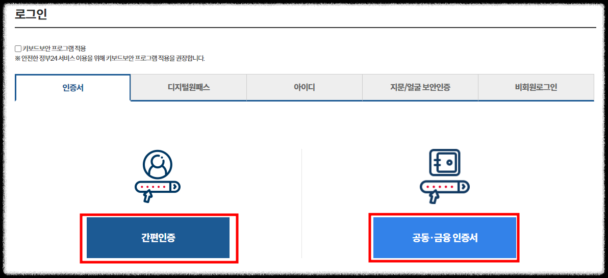 - 로그인을 선택해서 간편인증 또는 공인인증서로 로그인을 해주세요