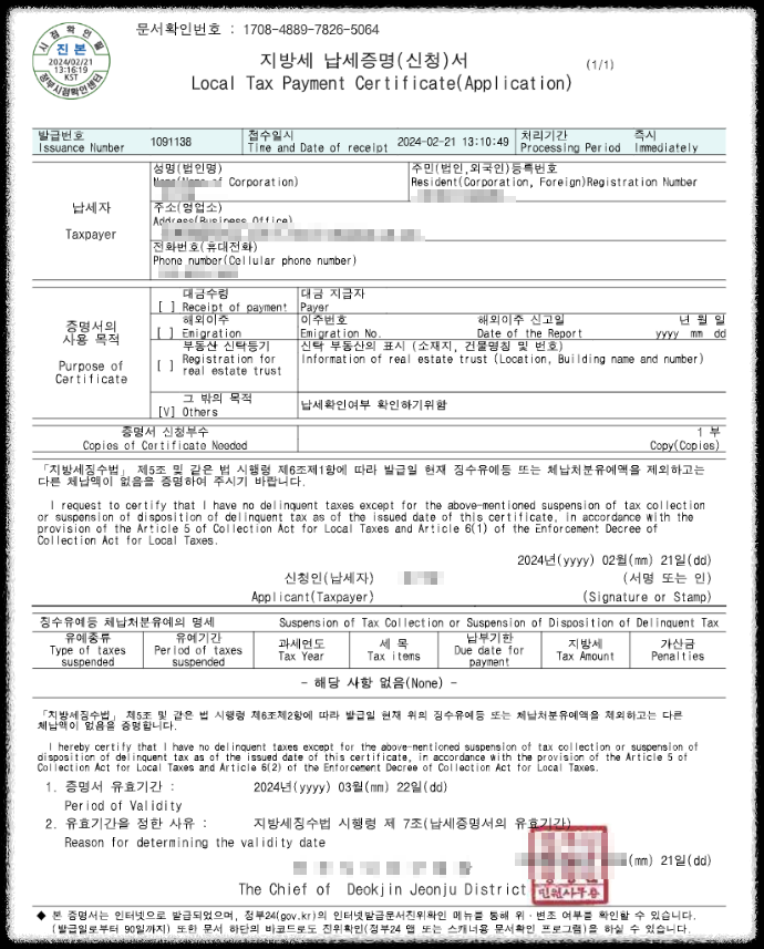 - 발급일과 발급기관: 지방세 납세증명서의 발급일과 발급한 지방자치단체(시/도청 또는 군/구청)의 정보가 기재됩니다.