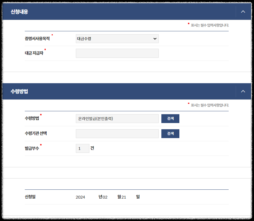 - 수령방법을 선택하시면 됩니다. 온라인으로 발급을 하시면 직접인쇄가 가능하고 PDF 파일저장도 가능합니다.
